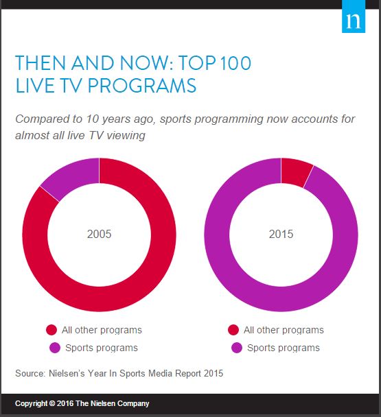 According to Nielsen’s Year in Sports Media Report 2015, sports content continues to thrive across all screens and formats and ratings and engagement numbers continue to get stronger. The amount of sports programming available to us has rocketed to meet what appears to be an insatiable demand. In 2015, more than 127,000 hours of sports programming were available on broadcast and cable TV, and viewers spent more than 31 billion hours watching sports, up 160% and 41%, respectively, from 2005.