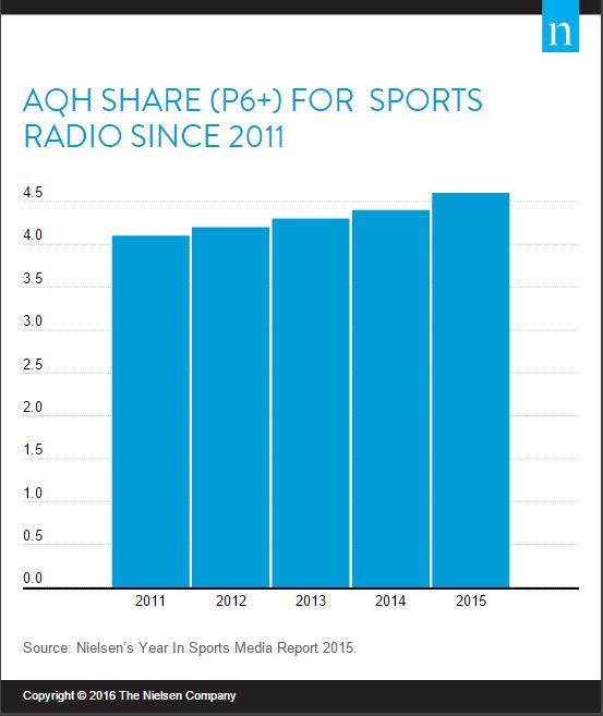 Not only is live sports consumption thriving on TV, but listening to games on the radio is on the rise as well. From 2011 to 2015, the average quarter hour (AQH) share for sports radio increased 12% (4.1% to 4.6%) and showed steady increases year over year. October 2015 saw the highest AQH share of the year at 5.5%, as the MLB playoffs, NFL and college football seasons were in full swing. According to a Nielsen audio cumulative reach study, over 30.2 million people listened to an NFL game on the radio over the course of the 2014-2015 season.