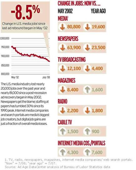 In the past two decades billions of dollars have flowed from publicly traded media corporations to a few Wall Street profiteers who have returned little value to the industry or the economy. I understand the argument that bailing out the auto companies prevents two million more Americans from joining the ranks of the unemployed. And I understand the trickle down impact that the auto industry has on other companies and segments of the economy. But these arguments don't hold water when subjected to a realistic examination of the industry's past or its likely ability to use bailout funds wisely. Although media and advertising companies depend on the auto industry for a major percentage of revenues, a bailout is likely to result in auto makers limiting marketing budgets to a fraction of current investments. Bailout or not, we can be reasonably certain the number of car dealerships will be cut in half over the next five years. Bailout funds are unlikely to make their way to Main Street and they definitely will not find a path to Madison Avenue. And at the same time, the federal government will be considering the imposition of a tax on advertising, increased regulation of pharmaceutical advertising and harsh privacy laws that could decimate the value of digital media. From 2002 to December 5 of this year the media industry has lost nearly 100,000 full-time jobs – or 10 percent of its total workforce. (See data below.) Based on current attrition rates, at least another 100,000 jobs could be lost in the next 12-months. (These statistics do not include nearly 1 million non-full time jobs and do not include related jobs in the advertising or entertainment businesses.) Fully 30% of these positions are in jeopardy.