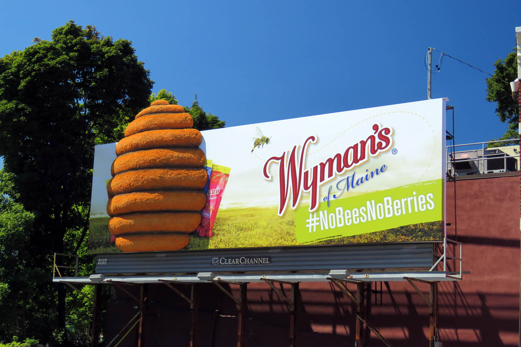Getting a jump on fall, Wyman's of Maine, the largest U.S.-owned blueberry grower, ran a social awareness campaign to draw attention to the plight of the dwindling honey bee population. Over the span of several weeks, Wyman's gradually added a growing beehive to their #NoBeesNoBerries billboard along an expressway in Boston. Watch it grow in the photos below!