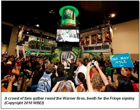 Some media entities really stood out more than others amid the carefully planned chaos, but none more than Warner Bros., which once again all but claimed the Con as its own. Its home base was a huge two-story booth on the floor at which stars from its movies, television series and D.C. Comics properties signed autographs for thousands of thrilled fans. (The signings could be seen dozens of aisles away on jumbo screens positioned high atop the booth.) Marketing and publicity executives at the company really outdid themselves coming up with clever ways to thrill fans at panels for their shows (such as the Barenaked Ladies leading an audience sing-along of their theme song for The Big Bang Theory). In its second year, Warner Bros.' Friday night V.I.P. media party became one of the Con's must-attend events. (More than twice as many people attended this year than last.) Meanwhile, the giant tote bags emblazoned with Warner Bros. franchises that proved so popular in recent years were once again among the most sought after freebies at the Con. Indeed, a number of other companies got into the bag game, as well. (The best was the Doctor Who bag from BBC America.)