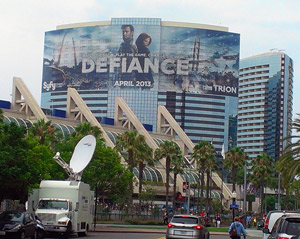 impressions – was a formidable building drape over the towering San Diego Marriott Marquis that featured the cast from the franchise and its title treatment. This image could be seen from virtually any vantage point around the Con and throughout the city. (This mammoth "Defiance" poster competed for attention with one for the upcoming NBC series "Revolution" that was similarly draped over the Hilton San Diego Bayfront at the opposite end of the convention center from the Marriott. But the "Revolution" drape revealed almost nothing about the show. The "Defiance" drape introduced the cast and established its post-apocalyptic setting.)