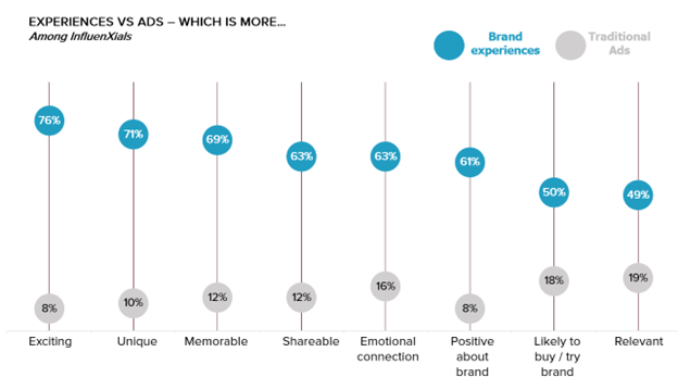 On a range of important dimensions, consumers are far more excited by brand experiences than traditional advertising. They consider brand experiences to be more likeable, unique and exciting. This is not a niche audience we are talking about: 80% of Americans have engaged (18%) or are interested in engaging (62%) with brand experiences, and this interest is high across all age cohorts.