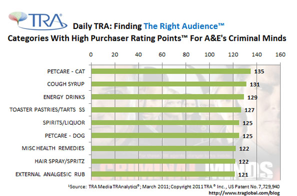 Viewers of the drama “Criminal Minds” on A&E follow along as the fictitious profilers of the FBI’s Behavioral Analysis Unit try to get into the minds of criminals to solve compelling cases in each episode. For advertisers and marketers who are trying to get into the minds of consumers and pinpoint programs and networks that deliver The Right Audience™ for their products, the path is decidedly more straightforward and just as compelling thanks to insights available from TRA. According to TRA’s Media TRAnalytics®, the audience for Criminal Minds delivers high Purchaser Rating Points™ (PRPs™) for such diverse categories as pet care (both dog and cat), cough syrups, energy drinks, toaster pastries, and spirits.
