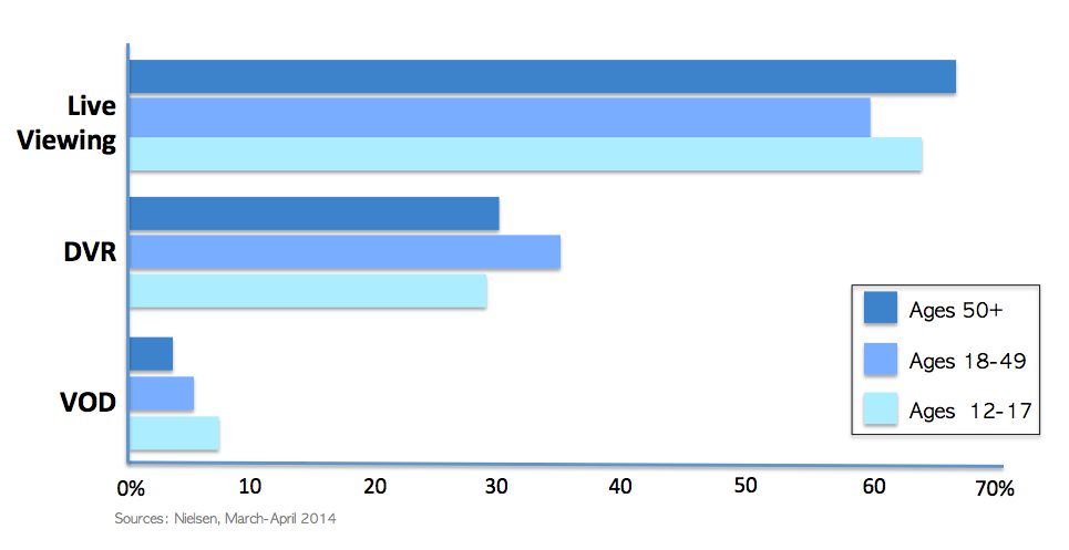 Despite all the discussion in the marketplace about time shifting, the explosion of devices has not changed the fact that live viewing is still dominant across all age groups (60-70% of all viewing), followed by DVR and VOD (Nielsen, March-April, 2014). DVR penetration growth has flattened in recent years and the growth and improvements in VOD -- both cable and online -- are giving us new opportunities to tap in to these viewers and monetize time shifted viewing. The other piece of great news here is that the audiences and viewership for VOD -- both cable and online -- are also growing considerably.
