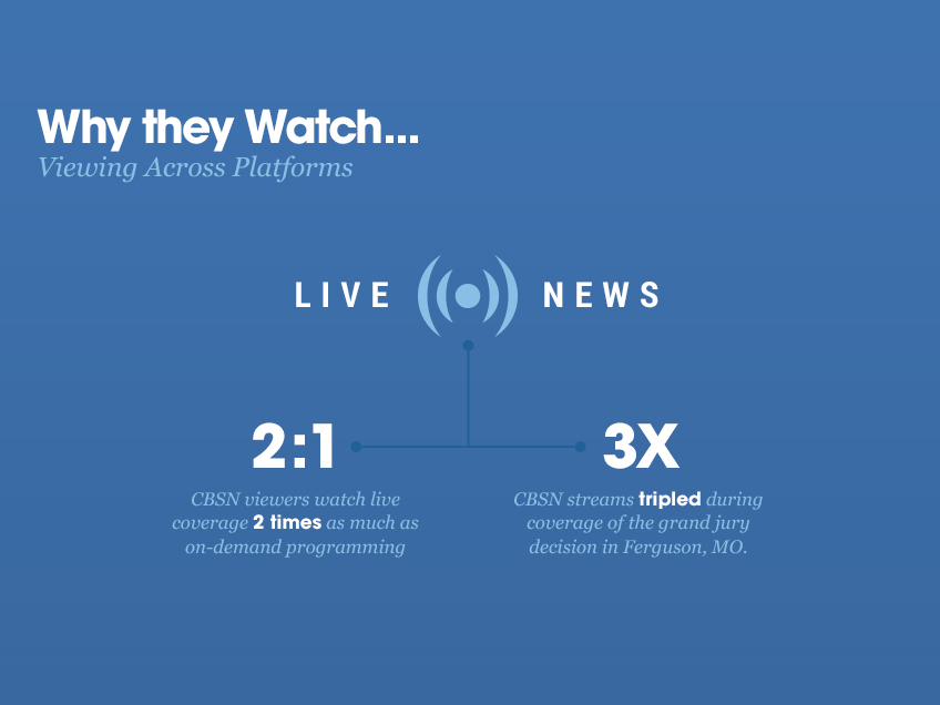 The fact that the majority of viewing is still live drove us to include the live feed of our CBS TV stations in our 14 owned-and-operated markets in CBS All Access at launch. We now have over 75 markets live, covering 70% of the population and plan to add more CBS affiliates in the coming months and expand this offering across the entire country. This move supports consumers' demand for live TV, especially our large event programming, and helps increase the potential audience for our content overall and our affiliates locally. CBSN, while providing each and every segment on a VOD basis, is also focused on being a live experience. This has proven to be the right strategy as CBSN viewers watch live coverage two times as much as they watch on-demand programming and they watch even more live when it comes breaking news.