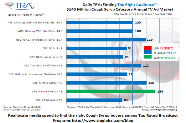 When you think of Hawaii, pictures of world class beaches, bright sunshine and the warm breeze comes to mind, certainly not coughing, cold and flu! But, as we get deep into flu season, while we sniffle, sneeze and cough, we try to find escape watching shows such as Mike and Molly and Hawaii Five-O, two of the top ten rated Broadcast programs that also delivered when it came to purchasers of Cough syrup products. Advertisers such as Nyquil, Robitussin, Triaminic, and Delsym should be advertising on these programs with The Right Audience ™ - purchasers of the Cough Syrups - if they want to maximize ROI and eliminate wasteful spending. This information is readily available using TRA’s patented Media TRAnalytics®, please visit www.traglobal.com.