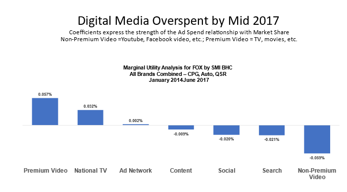 However, when one considers other important value measures, such as long-term brand equity, and such as share of market measures, one sees a completely different picture of the world. The Fox BHC SMI ROAS study, which measured $2.2 trillion in sales against $48 billion in ad spend (SMI) to detect correlations of media types with brand share changes (IRI in the CPG category), we saw more losses of brand share than gains for the CPG advertisers during the months in which they used more digital, less TV.
