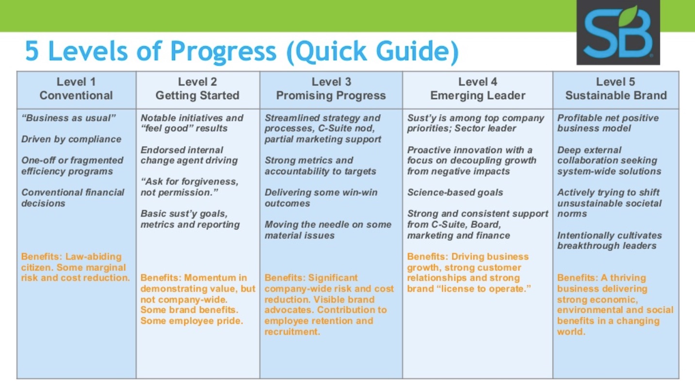 The matrix defines five core principles of what it would mean to actually become a sustainable brand. Then five levels of maturity against that ambition, so that companies can self-assess where they are on the journey. The principles start with having a purpose beyond profit that is embedded into everything the company does and that everybody at the company understands, to using the power of brand for system-wide influence. It recognizes that brands are the ones that are really creating cultural aspiration. We are the entities that defined what the good life looks like and should look like in the last century.