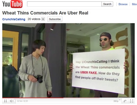 Exhibit D: Wheat Thins "uber-fake" spot sends a pallet full of wheat thins to yet another real life tweeter who claims the Wheat Thin ads are uber fake.