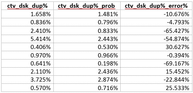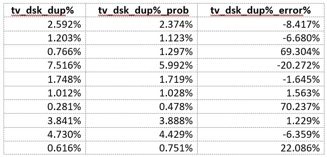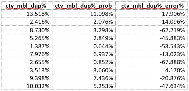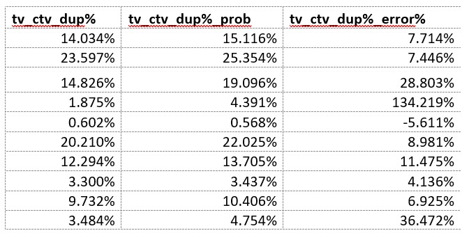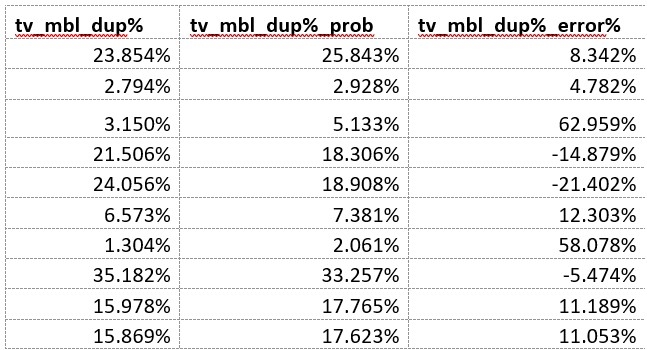 First let’s look at the errors of random duplication when considering the campaign’s duplication between its linear TV and its CTV. The first column is the official Nielsen ONE Ads published numbers, the second column is what random probability would estimate that duplication to be, and the third column is the percent error in the random probability deviation from the empirical measurement number: