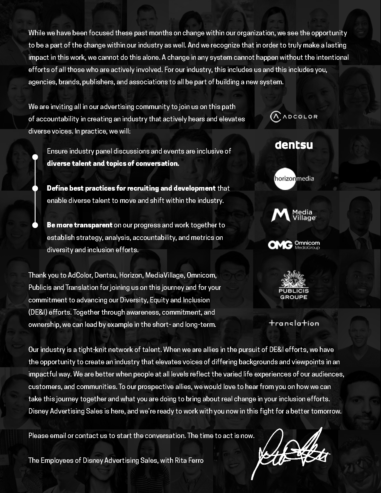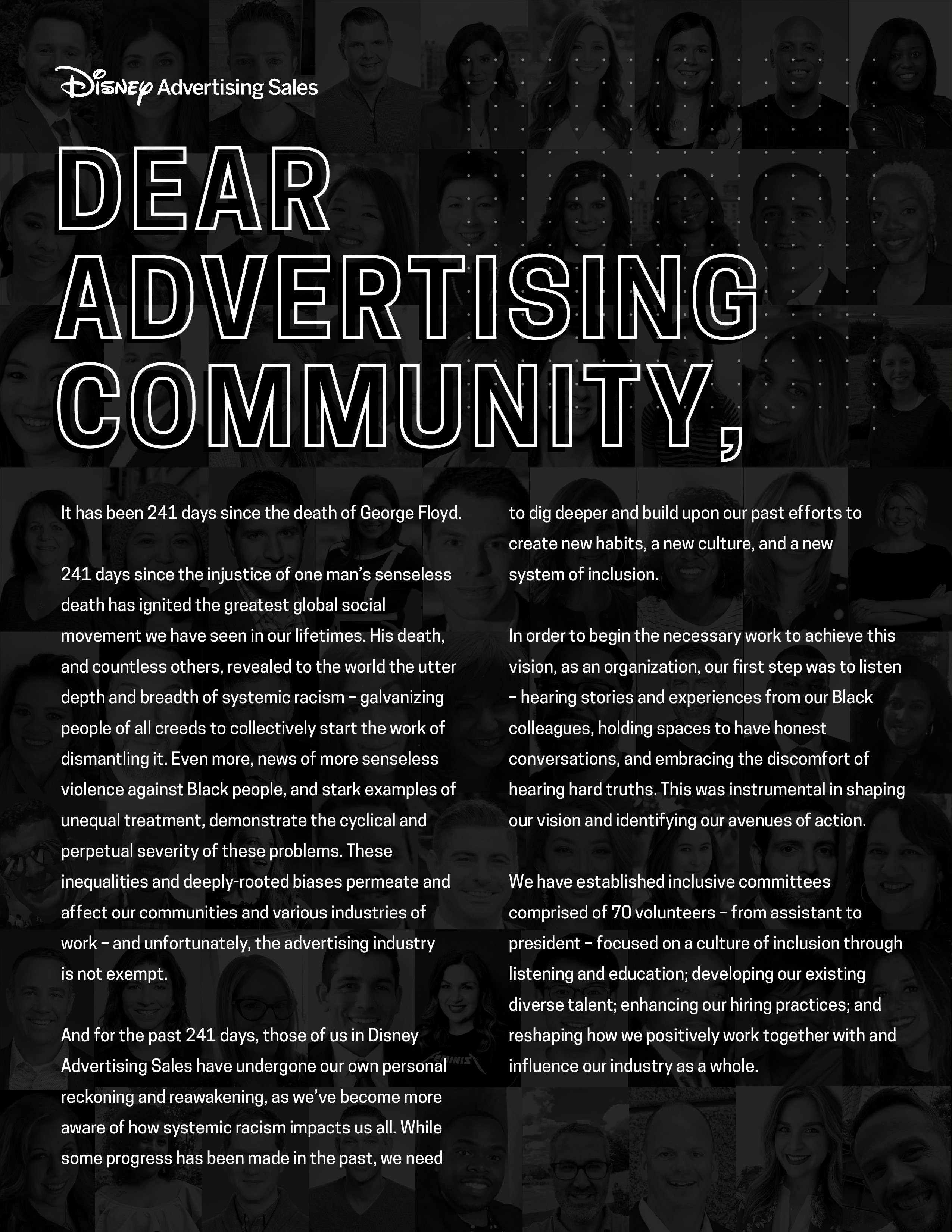 For Jeanette Herbert, Manager, Brand Connect, Disney Advertising Sales, it was evident that more work needed to be done. "Following the racial reckoning last summer, our Disney Advertising Sales team formed four executive committees, and there was a groundswell of passion and interest from our employees. This letter is one of many initiatives that we've mobilized" Dear Advertising Community speaks for itself in tone and candor. Its opening salvo speaks truth to power "It has been 241 days since the death of George Floyd." Let's sit with that for a moment. It has been 240 days since the death of George Floyd. Time has indeed passed, but the urgency for change in the advertising industry has not dimmed. Dear Advertising Community recognizes that the industry must resist the temptation to fall into its old ways. What is novel in the letter structure is the realization on the part of the Disney team that they also have work to do. The letter reads as much as an internal mandate as an outward-facing manifesto. The letter states, "A change in any system cannot happen without the intentional efforts of all those who are actively involved. For our industry, this includes us, and this includes you: agencies, brands, publishers, and associations to all be part of building."