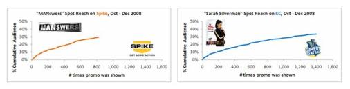 An example illustrates this idea. The charts below show on-channel promotion frequency versus the percent cumulative audience reached by promotions for two programs, "MANswers" on Spike and "The Sarah Silverman Program" on Comedy Central, from October through December 2008. The curves have a logarithmic as opposed to straight-line or exponential shape, indicating the diminishing marginal return of each successive promotion.