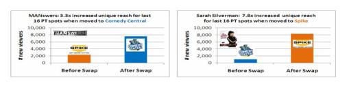 A solution would be to swap spots for these shows across the two networks. We performed a hypothetical one-to-one swap of 16 saturated prime-time spots between MANswers and Sarah Silverman. We saw that doing so greatly increased the number of new viewers exposed to both promotions, since cross-channel viewers were much less likely to have been previously exposed.