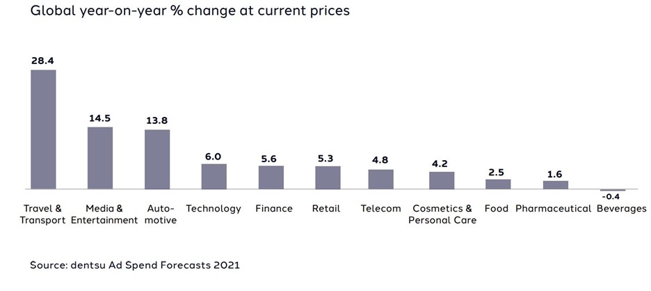 Finally, the report provides an industry-specific forecast of growth. The hardest hit sectors of our economy due to COVID-19 has been travel, media & entertainment, and, given the double whammy of job losses and a move to a work-from-home culture, the automotive sector. Dentsu expects all three to rebound in 2021.