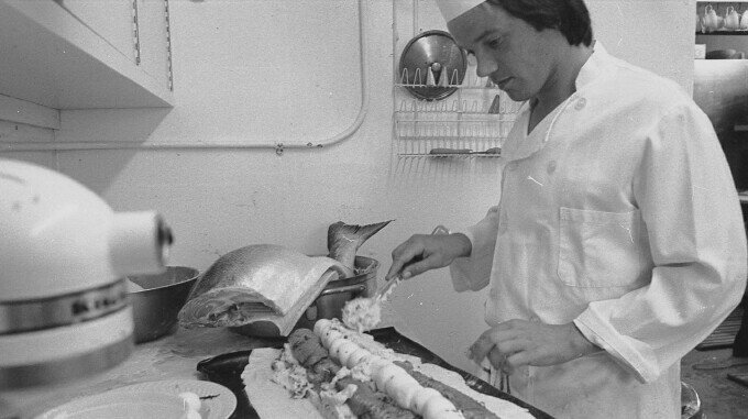 "I stretched out pizza dough, added some finely chopped onions, and baked a few minutes," he says in the film. He added crème fraîche, thin-sliced salmon and dollops of caviar.