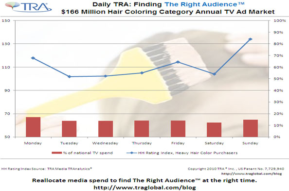 When comparing the day of the week viewing, TRA’s Media TRAnalytics® can help you find the best day of the week to reach those who are heavy Hair Color category buyers. According to Kantar Media Research, for the third quarter of 2010, hair color advertisers are spending roughly the same percentage of their TV ad dollars equally across each day of the week. But Sunday is a day that has a particularly high concentration of these Hair Color purchasers. To reach this target, Garnier Nutrisse and Nice N Easy, should consider reallocating their TV spend to have more weight on Sundays.
