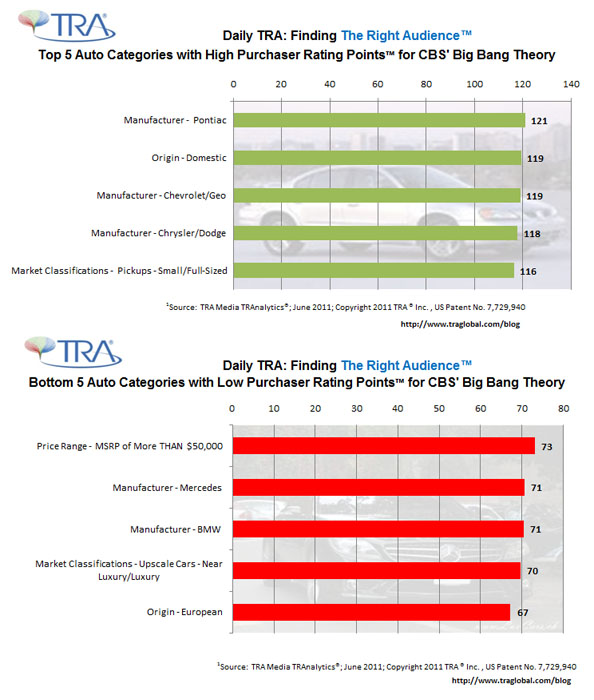 Experts are predicting that fans of The Big Bang Theory would also enjoy watching TV’s newest comedy series, New Girl. As depicted in the charts below, domestic car brands indexed highest for The Big Bang Theory while European and luxury cars indexed lowest. Advertisers such as Pontiac and Chrysler, should be considering placing their ads on new programs such as New Girl if the predictions are correct! With that in mind, networks are able to use TRA’s Media TRAnalytics® to match viewing behavior with actual purchase data. Armed with this vital information, networks are able to attract the right advertisers to their new programs, that is, advertisers whose products are being purchased by the viewers of the programs. Advertisers are also using Media TRAnalytics® to find out exactly what networks, programs and dayparts work best for their products and provide them with the highest return on investment. Remove the guesswork, plan and buy media with TRA’s Media TRAnalytics®.
