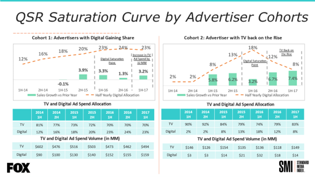 This graph shows what it looks like when a brand gets hooked on the idea of shifting more and more and more into low-CPM digital and out of TV and streaming. On the left are the chains that moved money out of TV into digital the most, on the right are chains that did the least of this. Over the 3.5-year period studied, brands on the left generally lost sales and never grew more than 2%, brands on the right generally grew sales by as much as 7% when digital dollars were moved back into TV. The green bars are the sales increases.