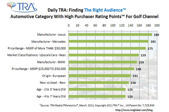 TRA’s Media TRAnalytics® and its unique metric, Purchaser Rating Points™ (PRPs™) provides timely information and customized insights that marketers are using to construct powerful TV advertising plans. As illustrated below (based on full-day PRPs), we know that the Lexus owners’ Golf Channel rating is 89% higher than the Golf Channel’s overall rating among all households; for Mercedes owners, it is 81% higher and for BMW owners, 54%.