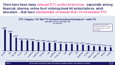 In addition to DTC, the quick shift in consumer's purchasing behavior and media consumption led by the pandemic combined with advertisers' desire for agility and flexibility has led to a greater number of DR advertisers in the market. As an example, online used-car exchange, Carvana, is an advertiser with a greater need for flexibility and has apparently shifted all or most of their TV spend to DRTV. Several categories to watch include Gaming, Online Education, Travel and Health & Fitness.