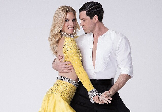 Dancing with the Stars ballroom bad boy Maksim Chmerkovskiy returned to the ABC show Monday night, albeit still in a sidelined capacity. After tearing his calf muscle during rehearsals for last week’s energetic jive, Chmerkovskiy flew to Cleveland, Ohio, to undergo surgery, leaving celebrity partner Heather Morris (pictured above with Chmerkovskiy) to continue her journey in the capable hands of DWTS pro Alan Bersten. But just because Chmerkovskiy is out for the moment doesn’t mean he’s entirely down for the count; he supervised his partner’s tango for this week’s show via Skype. With the surgery behind him, the DWTS champ was back in the studio Monday night and hopes to be dancing as soon as possible. (MediaVillage.com’s behind-the-scenes coverage of Dancing with the Stars Season 24 continues below.)