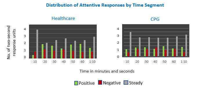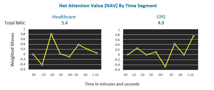 The momentum of the commercials showed different attention flow patterns. Net Attention Value (NAV) weights the number of attentive moves by their magnitude, taking account of both the length and direction of each move on the numeric scale. NAV does not give a value to the steady periods. An unpromising start in the healthcare spot led to a great spike, but negative direction prevailed, save one additional recovery. In the CPG vignette commercial attention patterns varied from segment to segment -- with one significant negative instance -- but ended on an up note.
