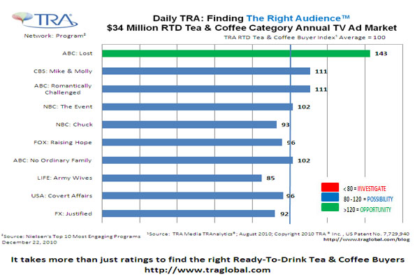 Among the top 10 most engaging programs of 2010 (as per the Nielsen Company, program “engagement” is measured as viewer attention to TV episode content) only one program was a good vehicle for targeting Ready-To-Drink Tea/Coffee purchasers. ABC’s final season of Lost was the only program among these top 10 that had significant audience concentration of the heavy purchasers of these products. Smart marketers like Snapple and Sobe understand that getting a positive return on marketing investment requires putting marketing dollars to work in the right vehicles and minimizing the waste inherent in talking to the wrong audiences.