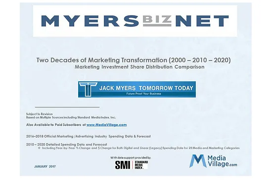 Total advertising spending is forecast to grow 3.3% in 2017 to $190.3 billion, spurred by 20% growth in digital spending that is offsetting 6.7% declines in linear/legacy media investments, according to the 29th Annual Jack Myers TomorrowToday Official Marketing/Advertising Industry Spending Data & Forecast. MyersBizNet publishes the only independent and most thorough analysis of marketing and media investments, covering 2000-2020 and including digital and linear/legacy spending in 28 media and marketing categories. 2016 data plus 2017 and 2018 forecasts are available for download below. Both above-and-below-the-line marketing communications investments are included. Full reports are available exclusively to MyersBizNet member companies at www.MediaVillage.com and by contacting maryann@mediavillage.com. Myers’ 2016 data was developed in association with Standard Media Index, which publishes regular ad spending data. Total marketing communications budgets are forecast to decline slightly (-0.6%) in 2017, resulting from 2.5% below-the-line budget reductions.