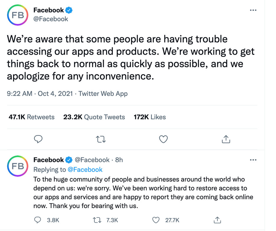 The network and its photo sharing app Instagram this week experienced a six-hour outage. Ironically, the outage was reported by Facebook on Twitter (see photo).