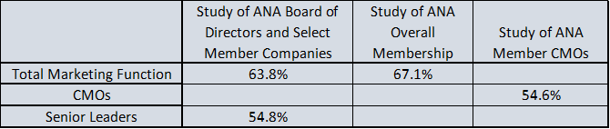 All the studies point to continued strong representation by females. Approximately two-thirds of ANA members are female with females occupying more than half of senior level positions, including CMOs. This chart provides the percentage of marketers who are female per each of the studies.