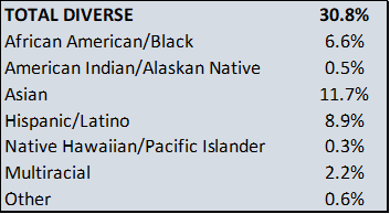 According to the study of the ANA board of directors and select member companies, the client-side marketing community is 69.2 percent White (Non-Hispanic), and therefore 30.8 percent diverse. The diverse segments include Asian at 11.7 percent, Hispanic/Latino at 8.9 percent, and African American/Black at 6.6 percent.
