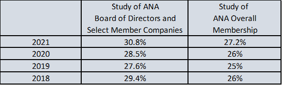 Despite the recent progress, there is still work to be done. While the report of the ANA board of directors and select member companies now shows 30.8 percent ethnic diversity, that is below the 42.2 percent diversity of the total U.S. population.