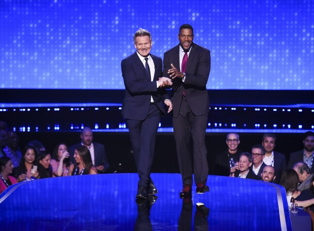Hosts: A mix of Fox Entertainment executives (including new Chief Executive Rob Wade), taking turns with Fox Sports and Fox News Channel talent. On the sports side, Fox NFL Sunday co-host Michael Strahan scored with his overall demeanor, and matched well at the outset with Gordon Ramsay, Fox's culinary series superstar. Ramsay (pictured at top with Strahan) didn't fail to sprinkle some F-bombs in his repartee with Strahan or later in the event.