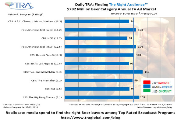 As we see in this example of the top rated broadcast programs for the week of January 17, 2011, these programs are doing just an ok job of reaching heavy Beer purchasers. But Beer advertisers empowered with TRA’s patented Media TRAnalytics® know the right environment in which to spend their TV dollars. These advertisers are minimizing their waste, increasing their sales and running to the bank with their increased return on TV investment! Here’s a toast to smarter ways to use television!
