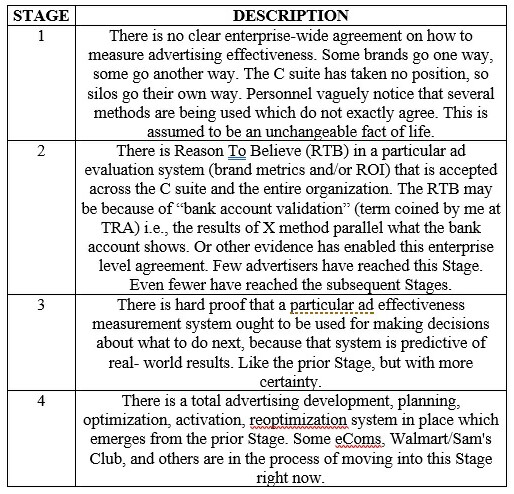 Within advertiser organizations there are four Stages of understanding of how to evaluate the effectiveness of advertising: