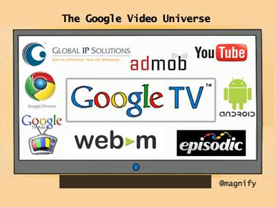 First, let's talk about the business. Google, for those of you who've been living under a rock for the past 10 years, is in the ad business. Big time. They've turned an agile little search bar into a massive cash machine, throwing off $23 billion last year in ad revenue. That's a pretty neat trick. But Google has been able to see the future -- and Google naysayers have been saying for a while -- "yeah, well, this text ad thing isn't going to grow this fast forever." True enough… which is why Google has been driving hard and fast in a whole lot of endeavors that may seem somewhat disjointed until you zoom out. In the past few months Google has closed on three transactions that are worth highlighting: WebM (Formerly On2, the owners of the codec VP8), Episodic (a tiny long form video software company) and AdMob (a huge ad network). OK kids - what do these three things have in common? Video. Next up, Google last week announced Google TV, a hardware/software solution that provides a TV Guide experience in a whole bunch of consumer electronics. And then there's the little reported purchase of Global IP Solutions as a solution for the Google mobile operating system Android's video chat. Starting to see a pattern?
