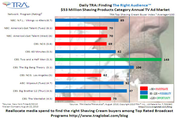 Now, planning media for shaving brands just got a little easier and a whole lot more effective. Look no further than the testosterone-filled sitcom Two and a Half Men (CBS), a show about two single men who shave to look their best, and a boy who's still too young to shave. Among the top-rated Broadcast programs for the week of August 16th, Two and a Half Men was the only program that popped with Shaving Cream purchasers. So the next time you're planning your media investment and trying to find The Right Audience™ for your brand, keep in mind, if you're not using TRA data, it could be a close shave.
