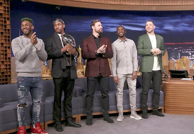 Much to my surprise I am still feeling charged up by the Big Game last Sunday. I never thought I would say this but watching that epic battle between the Philadelphia Eagles and the New England Patriots – right until the dramatic final moments -- was much more exciting than anything else I saw that night, including the halftime show, the special telecast of This Is Us that came later and, most notably, the commercials. Sports aren’t a primary focus in my life or my career; entertainment programming always comes first. But the opposite happened on Sunday. With apologies to Bill Belichick, Tom Brady and their crew, the Eagles’ first-ever Super Bowl win seems to have helped lift everyone’s spirits to a level they would not necessarily have reached had the game ended with a sixth victory for the Patriots. (Pictured above, left to right, are Eagles Jalen Mills, Alshon Jeffery, Chris Long, Nelson Agholor and Zach Ertz, who appeared Tuesday night on The Tonight Show Starring Jimmy Fallon.)