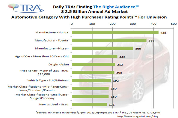 Looking to advertise Honda, Toyota or Nissan? These Asian made cars are more likely to be owned by Hispanics, making the Univision network the perfect place for car advertisers. This information is readily available using TRA’s Media TRAnalytics® StoryFinder™ report and provides networks with the insight into which products indexed the highest in terms of Purchaser Rating Points™ on their programs, making them prime prospects for future media buys. Advertisers armed with this information know exactly what programs, daypart, pod position etc will provide them with the highest exposure and the highest return on investment by delivering The Right Audience™. Learn more about TRA at www.traglobal.com