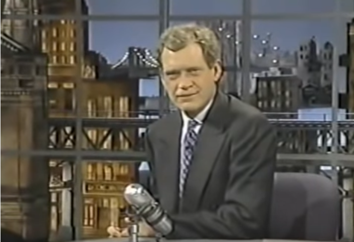 At Late Nighton NBC and in his earlier talk shows, Letterman's persona was that of a wiseass little brother. He invented, or at least personified, a generation of ironic comedy that commented on the media, even as his show was a part of it. At NBC, he developed signature goofy segments like "Stupid Pet Tricks" and he often found comedy in the mundane, just by being himself in unexpected situations. When General Electric bought NBC in 1986, a camera followed him to GE headquarters, bearing a basket of fruit. His attempt to deliver it to executives yielded a genius bit of rebellious, smart-aleck comedy.