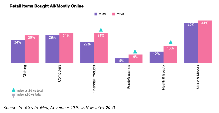 While the majority of people continue to shop a combination of online and in-store, we're seeing notable growth in the number of people saying they shop exclusively or predominantly online for many categories. Upwards of three in ten consumers say they buy online for all/most of their clothing, computers, financial products, and music & movies.