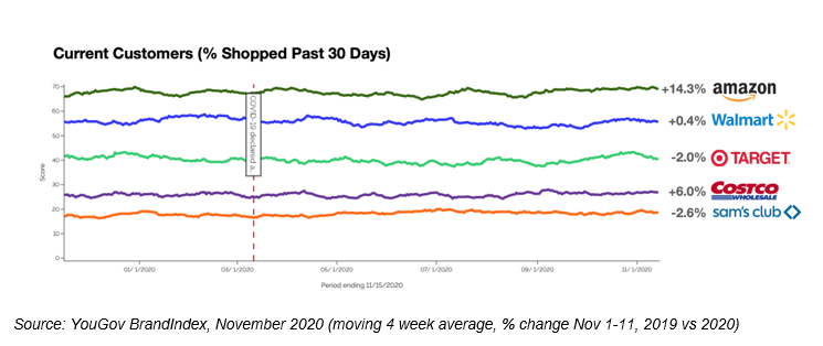 As spending online increases, Amazon is reaping the lion's share of those gains with +14.3% year-over-year growth in people shopping the retailer. We also see growth for Costco (+6.0 vs last year), as consumers look to stock-up and reduce their frequency of shopping trips.