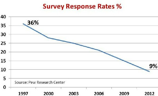 Consumer misgivings about commercial intrusiveness into their personal lives mean survey response rates are sinking. The Pew Research Center agrees “response rates have fallen dramatically,” documenting that response rates have fallen by -75% since the late 1990s: