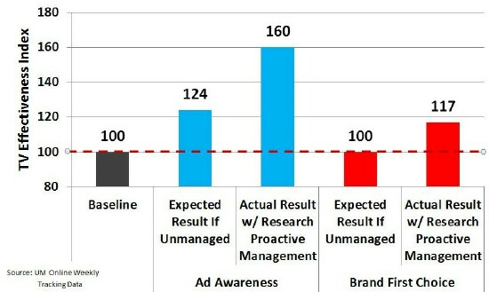 In one example earlier this year, the UM research team actively monitored a low-weight TV campaign using a weekly online tracker. Two-thirds of the way through our weekly tracking we were able to determine the campaign was not meeting its communication KPIs. We alerted the media investment team and the client and recommended rearranging both the remaining weeks of activity and the weekly weights. Through the research team’s proactive weekly management, the impact per GRP for an acid-test metric such as the brand being a prospect’s First Choice improved by +17%: