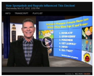 Young people, who voted overwhelmingly Democratic, had their politics shaped by Nickelodeon. In my survey of today’s college students for my new book Hooked Up, I discovered how many of their ideas, perspectives, sensibilities and attitudes could be tracked back to Nickelodeon. Nick programs like Rugrats and Spongebob Squarepants dominate the shows they name as their favorites at age 12 or younger. While Fox News may influence the generations that are quickly losing power, it’s the Rugrats generation who are now assuming power. Watch this week’s video on the Rugrats generation and their influences.