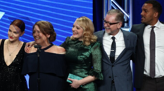 But in many ways the night belonged to former NBC Entertainment President Warren Littlefield, now one of the hottest showrunners working in television. He took the stage twice with the cast of The Handmaid’s Tale to accept its awards, and again to accept the coveted TCA Heritage Award, which recognized Seinfeld, the classic comedy Littlefield supported while overseeing NBC Entertainment in the ‘90s. (Littlefield is pictured below, second from right, with members of the Handmaid's team.)
