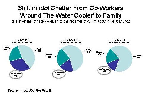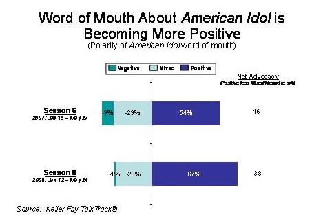 At the same time as conversation about "Idol" was beginning to shift from the workplace or school to home, the "quality" of WOM began to improve dramatically. In 2007, conversation was far more polarized than it was last season – with conversations about the program more likely to be positive and less likely to be negative in tone.