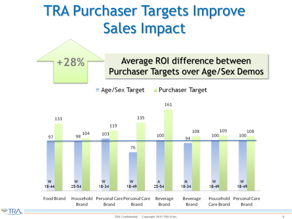In my previous post I called attention to the traditional media agency contract which often includes guarantees on sex/age GRP/impressions and reach, all at the client's budget level -- and I pointed out that this contractual guarantee prevents the agency from making buys that have the greatest ROI and brand equity effects. For example, TRA proved that sex/age is typically not predictive of sales effects (see graph below) and showed that using purchaser targeting in all-rotation buying averaged a mere +4% ROI lift vs. +28% for buys mixing fixed program position buying with rotations.