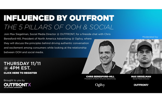 The connection between out of home and social media has become a powerful cultural force. When pairing the two together, brands can increase targeted impressions, amplify messaging and drive offline to online engagement. Join Max Siegelman, Social Media Director at OUTFRONT, for a fireside chat with Chris Beresford-Hill, President of North America Advertising at Ogilvy, where they will discuss the principles behind driving authentic conversation and excitement among consumers while looking at the relationship between OOH and social media.